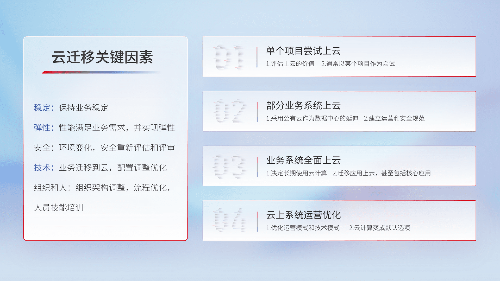 结合实际业务,,,,从规划设计、、云平台选型、、、云原生改造、、数据迁移、、集成交付,,,,迁移全过程为客户识别最佳上云路径,,,做好风险识别管理,,设计网络架构、、、、身份权限、、安全审计合规、、、、操作审计、、日志审计、、、监控告警策略、、多站点容灾设计等,,,对云上基础设施进行整体规划,,,提升IT治理水平,,以满足弹性、、、、高可用、、、、高性能的需求。。。。