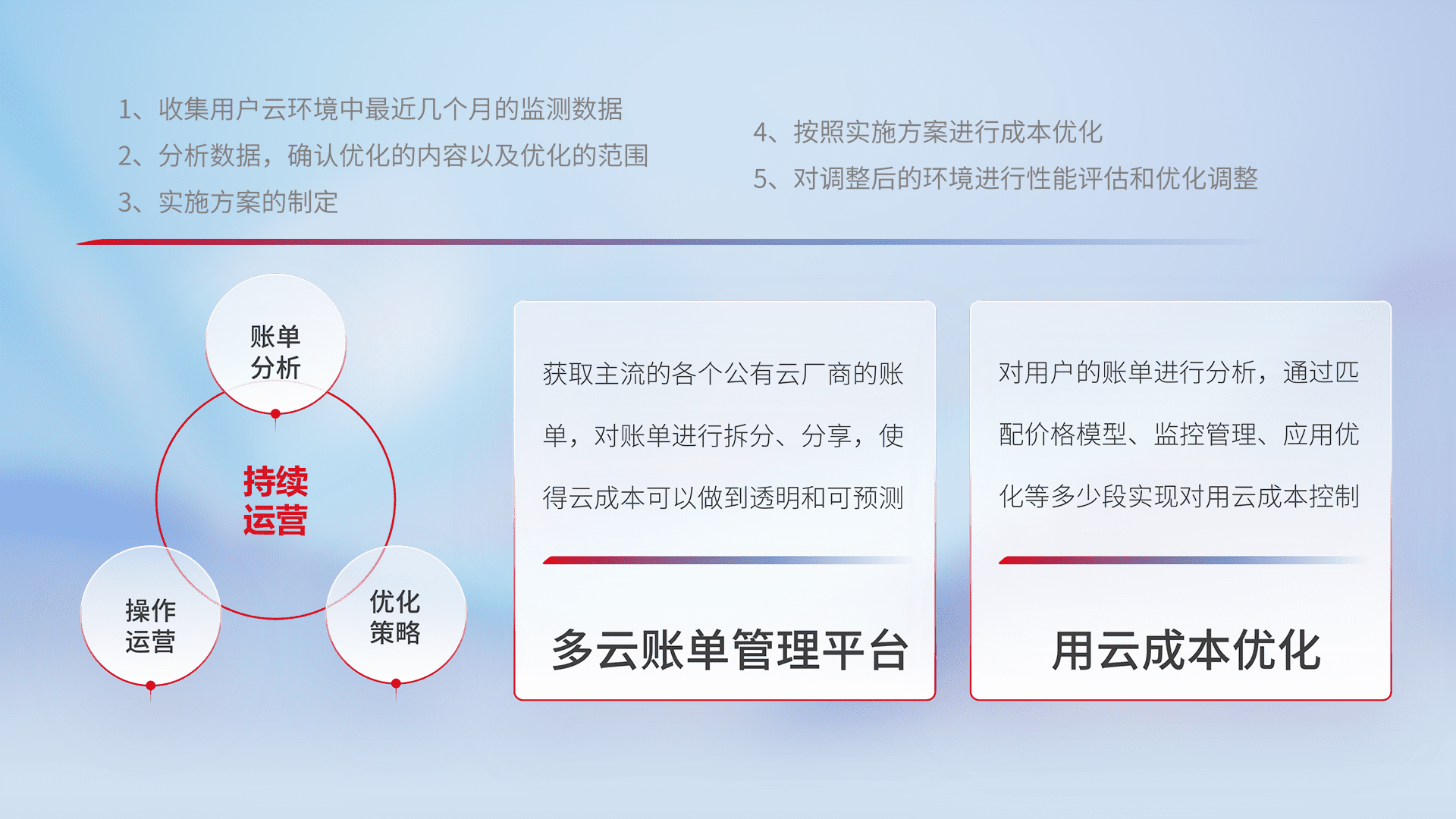 通过多云纳管,,以统一的资源数据模型把客户的云资源进行抽象和封装,,,,进而实现对多云资源的统一操作,,,保障云资源管理的可靠性、、、稳定性与可用性。。。。量身定制化运维内容,,配置、、、、开发运维、、、、补丁管理、、、备份、、监控、、认证和访问管理、、、审计和日常巡检等,,,保障在用云过程中的可靠度,,,稳定度以及高可用率。。。。
